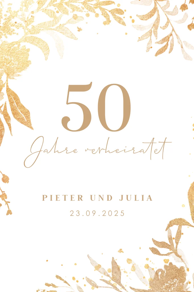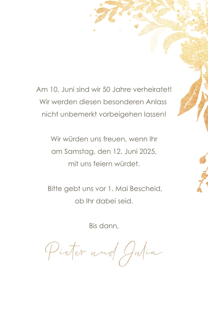 Schlichte Goldene Hochzeitseinladung in Weiß und Gold.