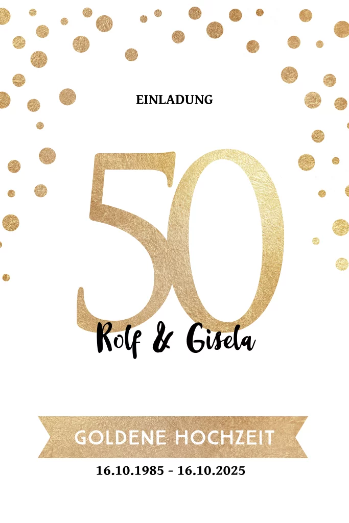 50 Jahre verheiratet, herzlichen Glückwunsch! Die Goldene Hochzeit ist ein wahrer Meilenstein. Als Belohnung für ein gemeinsames Leben, das alle Höhen und Tiefen überstanden hat, dürft Ihr jetzt Eure Goldene Hochzeit feiern! So ein besonderes Fest bedarf natürlich auch besonderer Einladungen. Die meisten Paare feiern Ihre Goldene Hochzeit gemeinsam mit der Familie und Freunden. manche sehr groß, andere eher im kleinen Kreis. Genauso verschieden ist die Kartenauswahl zum Thema. Natürlich bietet sich für die Goldenen 50 eine Goldveredelung hervorragend an.