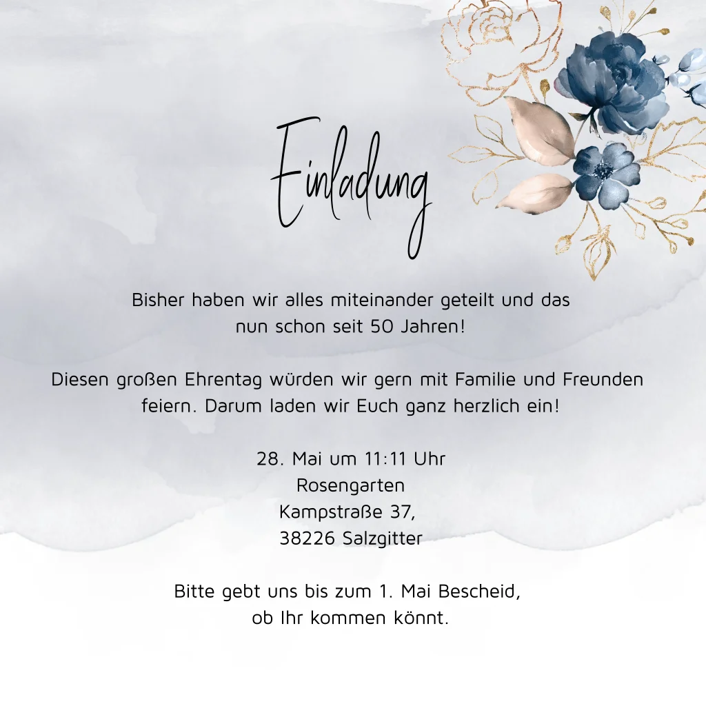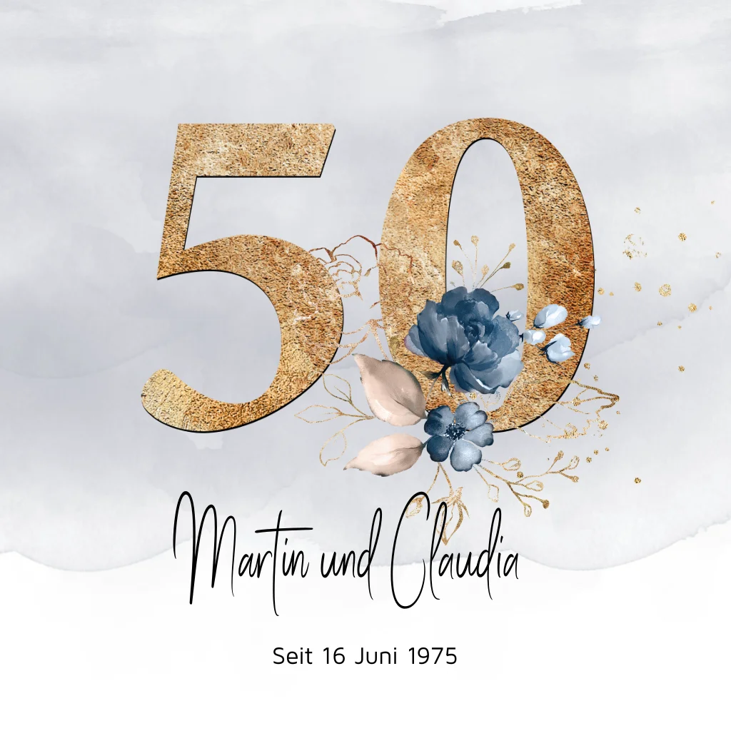 Eine schicke Karte für Ihren 50. Hochzeitstag. Laden Sie alle Ihre Freunde und Familie ein, diesen besonderen Anlass gemeinsam zu feiern. Ein hellblaues Aquarell ist Hintergrund dieser Karte. In der Mitte steht die Nummer '50' mit ein paar schönen Blumen. Im Inneren ist Platz für zwei Fotos. Dies macht Ihre Karte noch persönlicher.