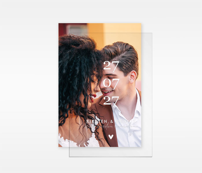 Acryl-Hochzeitseinladung mit Datum in Weiß und optionalem Zusatzblatt. Dieses Design ist perfekt für Paare, die nach einer stilvollen und modernen Einladung suchen.