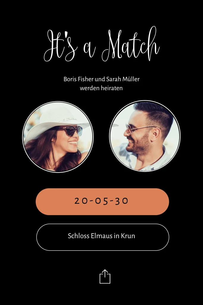 Hochzeitseinladung mit runden Fotos und großen Buttons. Dieses Design ist perfekt für Paare, die nach einer ausgefallenen und stilvollen Einladung suchen.