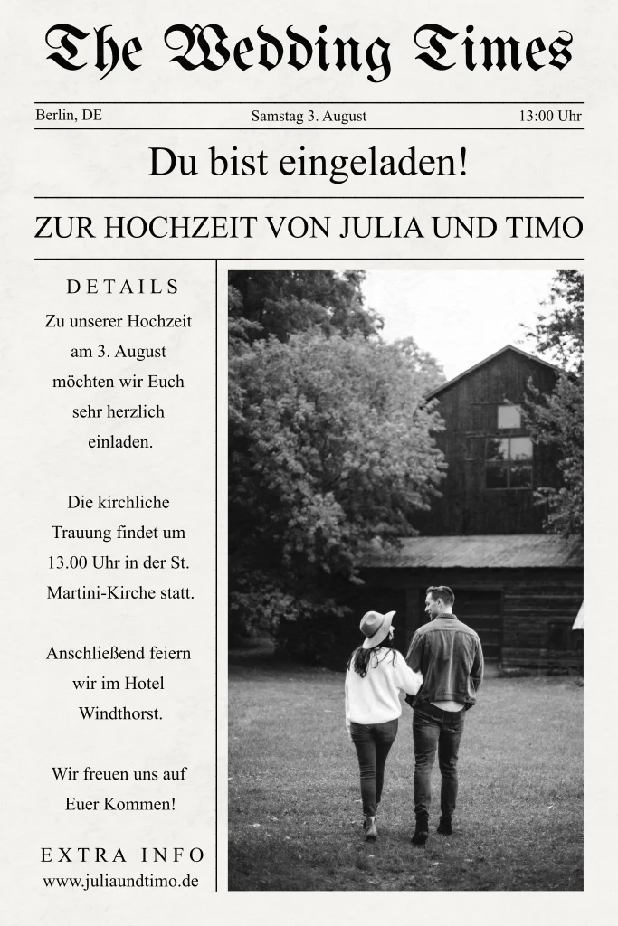 Sieh dir hier all unsere Hochzeitseinladungen im Zeitungsstil an.