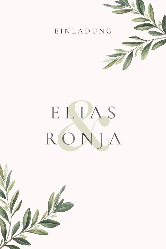 Botanische Einladungskarte zur Hochzeit mit Olivenzweigen.