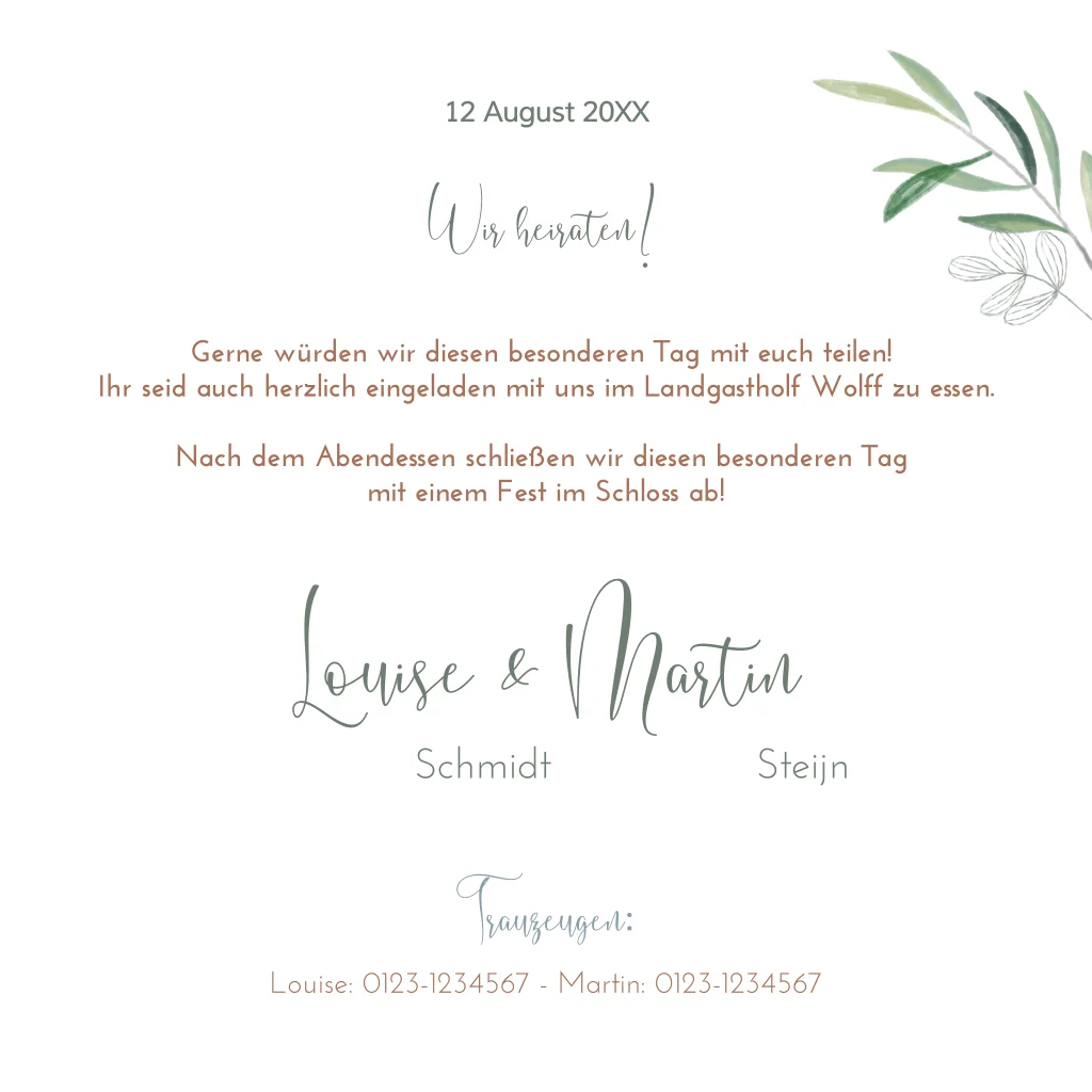 Schöne Hochzeitskarte mit Illustrationen von Blumen und Blättern in Aquarell gezeichnet.Bei quadratische Karten fällt ggf. ein anderes Briefporto an. Alle Infos findest du auf der Website der Deutschen Post. Zu diesem Format erhältst du Umschläge in der Größe 14x12,5 cm. Format ändern ist möglich.