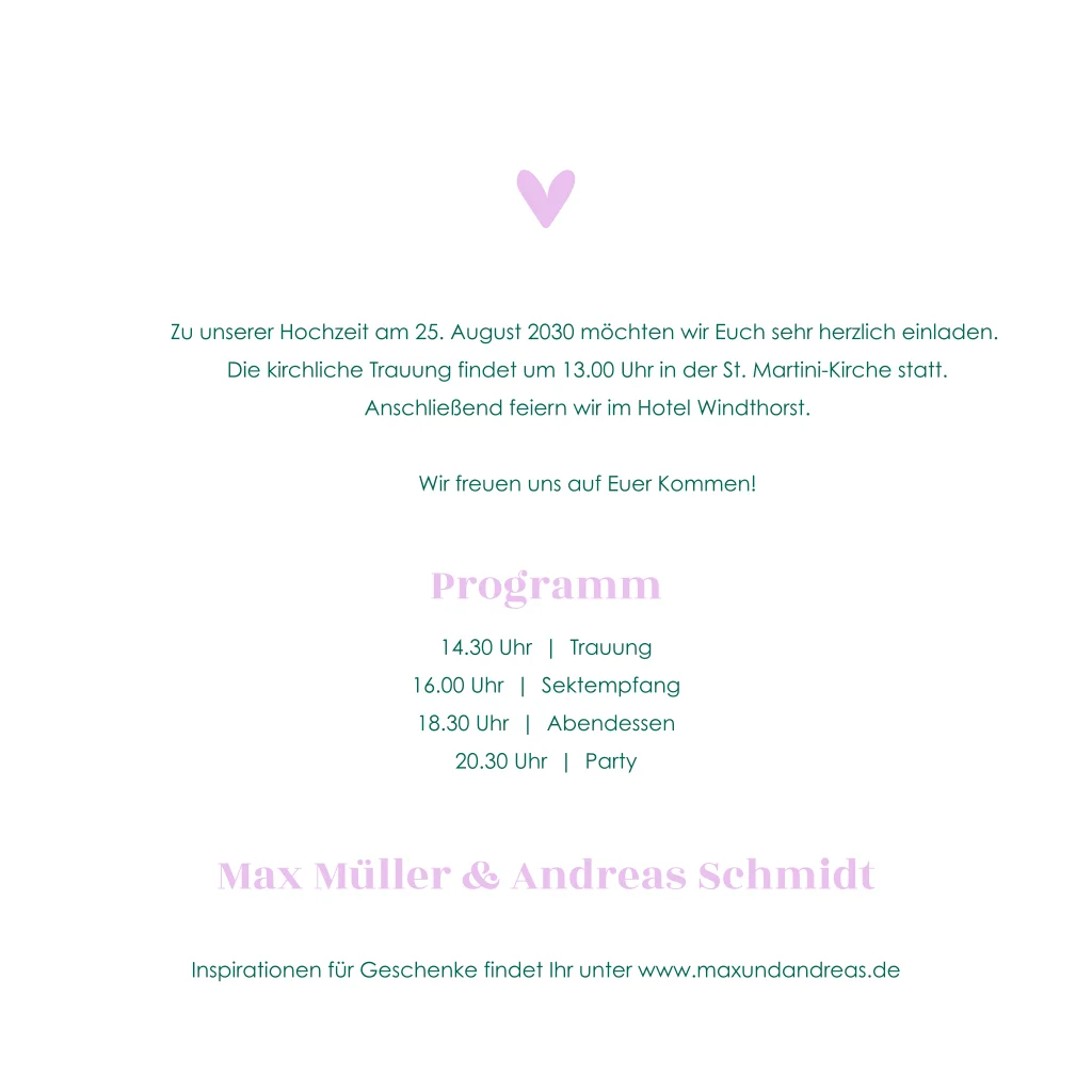 Hier findest du alle unsere Hochzeitskarten mit Kalender. Hochzeitseinladung im Color-Blocking in Grün und Lila. Dieses Design ist perfekt für Paare, die nach einer modernen und farbenfrohen Einladung suchen.Sieh dir auch die dazugehörige Save the date Karte, Menükarte und Dankeskarte an.