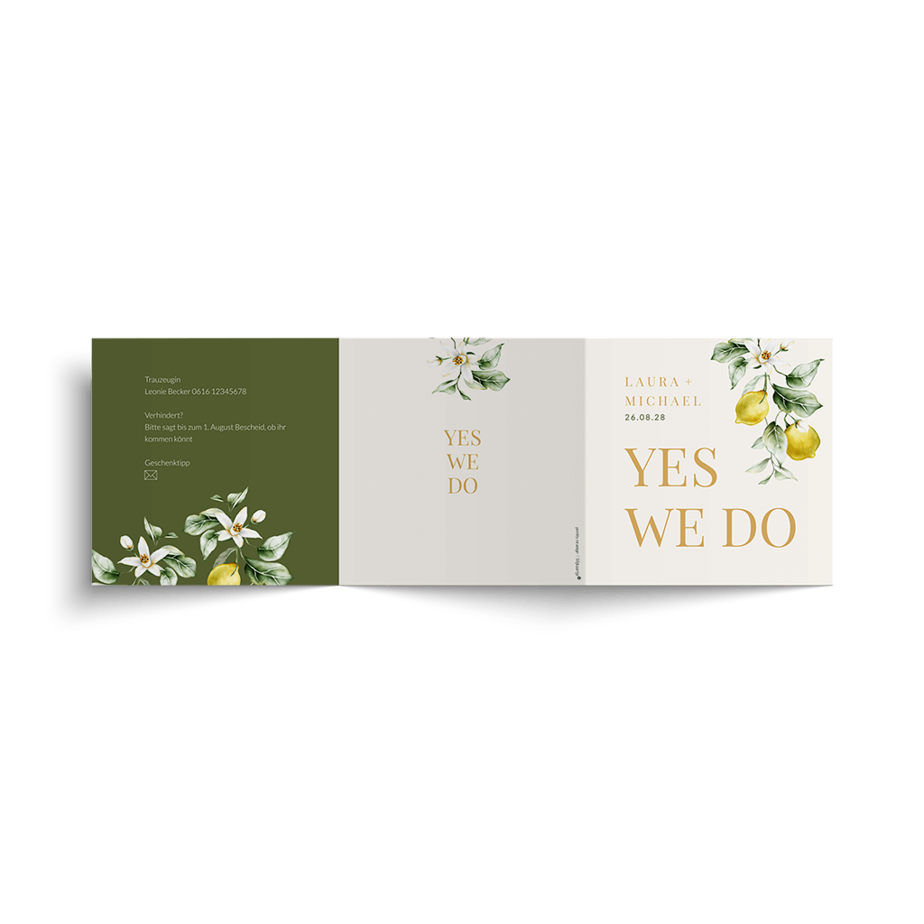 Einladung zur Hochzeit als Doppel-Klappkarte mit eigenem Foto und Zitronen.