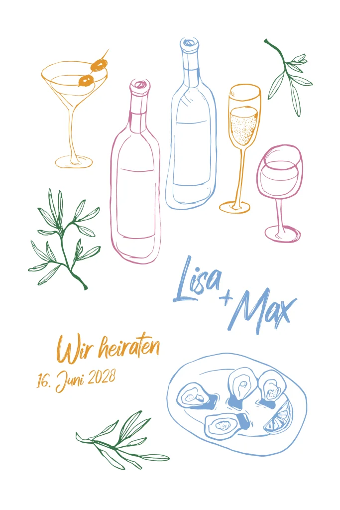 Fröhliche Einladung zur Hochzeit mit gemalten Zweigen, Austern und Getränken. Dieses Design ist perfekt für Paare, die nach einer ausgefallenen und modernen Einladung suchen.