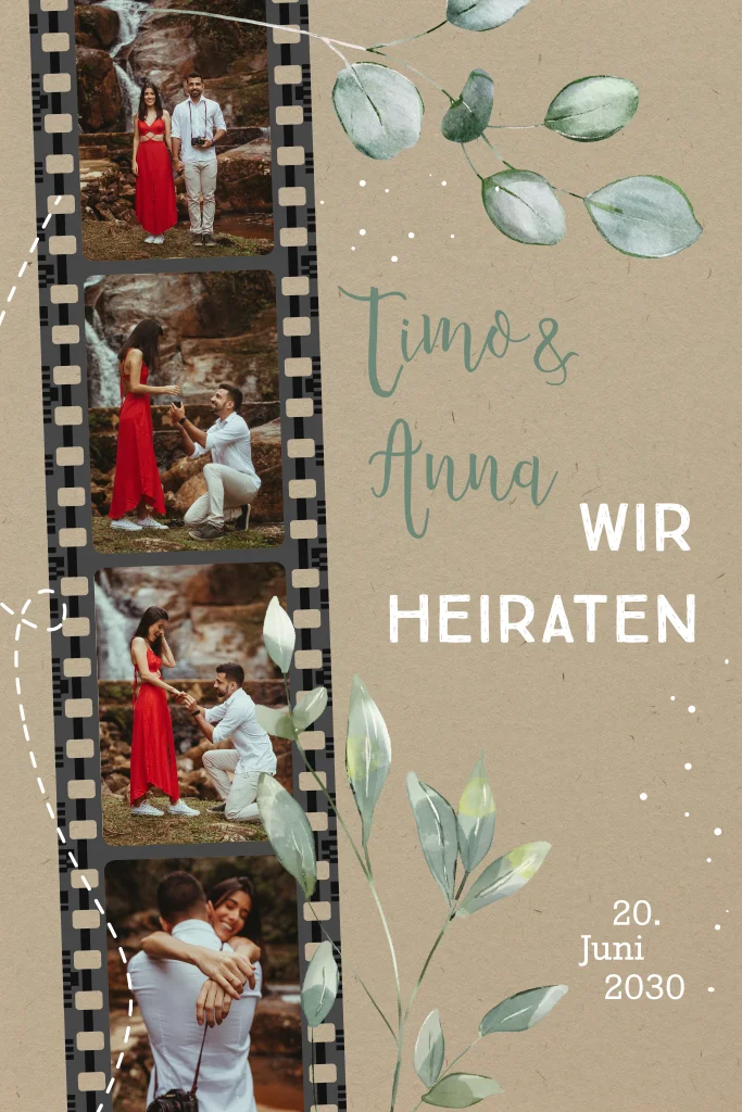 Hochzeitseinladung im Kraft-Look mit Eukalyptus und Fotostreifen. Dieses Design ist perfekt für Paare, die nach einer einfachen und natürlichen Einladung suchen.
