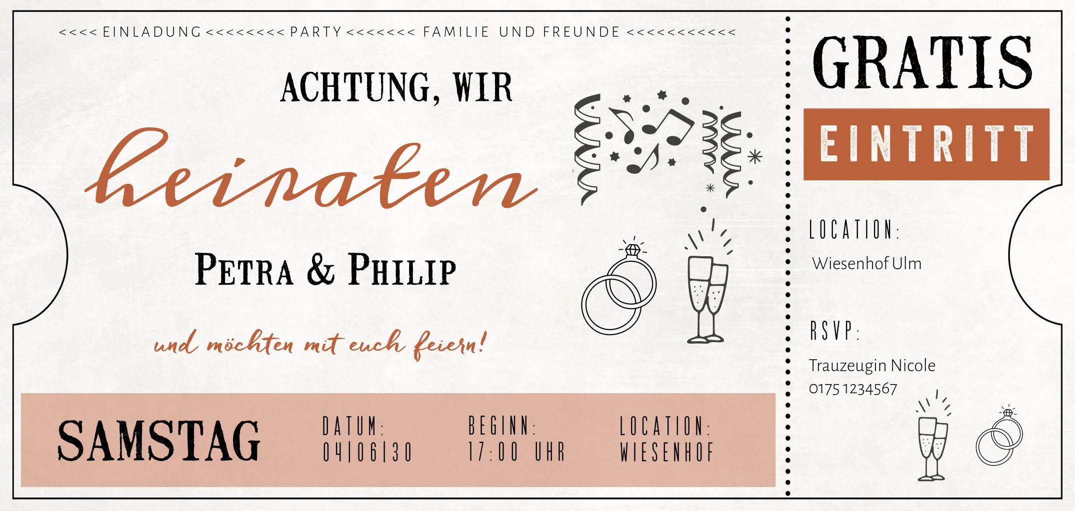 Hochzeitseinladung im Ticket-Look in Rosa- und Beigetönen. Dieses Design ist perfekt für Paare, die nach einer ausgefallenen und verspielten Einladung suchen.Melde dich für unseren Newsletter an und profitiere von exklusiven Angeboten, kreativen Ideen und Neuigkeiten aus unserer Produktwelt. Als Dankeschön für deine Anmeldung schenken wir dir einen kostenlosen Probedruck deiner Karte.