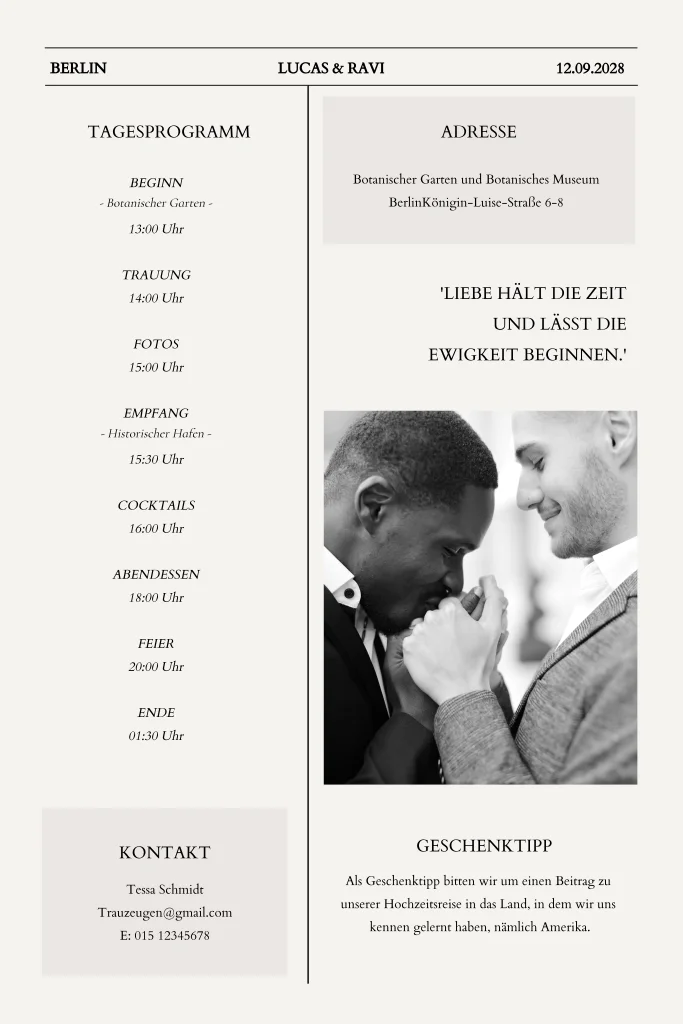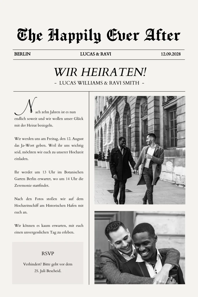 Originelle Hochzeitskarte im Zeitungsstil mit Fotos und klassischen Details. Dieses Design ist perfekt, um Ihrem besonderen Tag einen Vintage-Look zu verleihen.Das Design der von dir gewählten Karte wurde automatisch in andere Formate umgestellt. Wähle einfach deinen Wunschformat aus und platziere alle Texte und Elemente an der richtigen Stelle im Editor. Du hast Fragen oder dein Favorit steht nicht zur Auswahl? Dann kontaktiere uns bitte und wir werden uns gemeinsam darum kümmern!