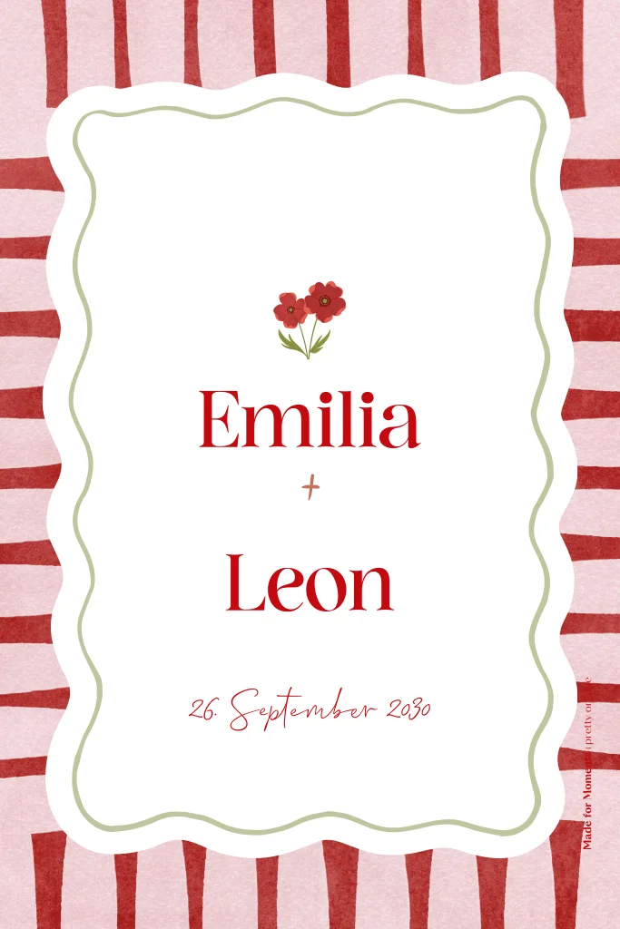 Hochzeitseinladung mit roter Schrift und rosa Rahmen und Streifen. Dieses Design ist perfekt für Paare, die nach einer verspielten und modernen Einladung suchen.Melde dich für unseren Newsletter an und profitiere von exklusiven Angeboten, kreativen Ideen und Neuigkeiten aus unserer Produktwelt. Als Dankeschön für deine Anmeldung schenken wir dir einen kostenlosen Probedruck deiner Karte.