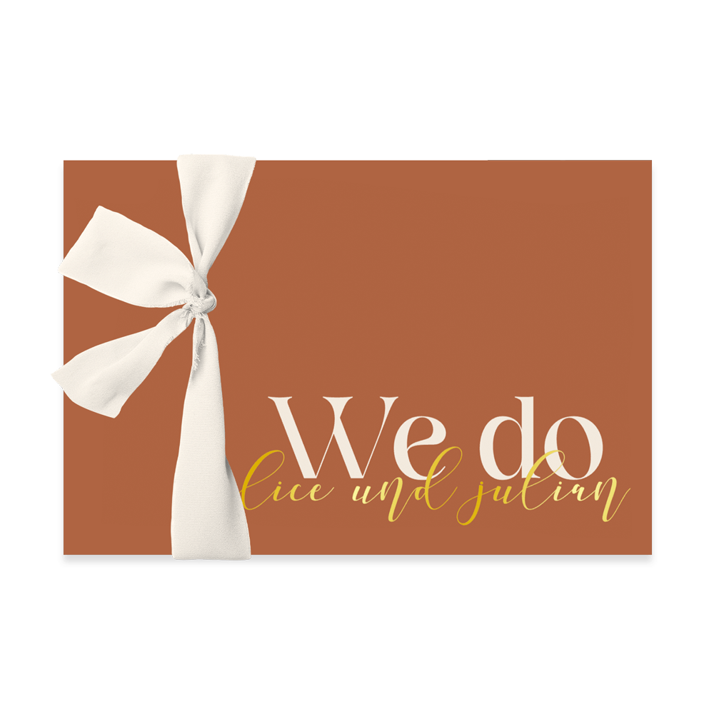 Hochzeitseinladung in Braun mit Goldfolie und optionalem Seidenband. Dieses Design ist perfekt für Paare, die nach einer stilvollen und eleganten Einladung suchen.Tipp: Um das Kartenset zu verzieren, kannst du wie im dargestellten Beispiel, Samtband benutzen. Siehe auch: Extraprodukte für Hochzeitskarten