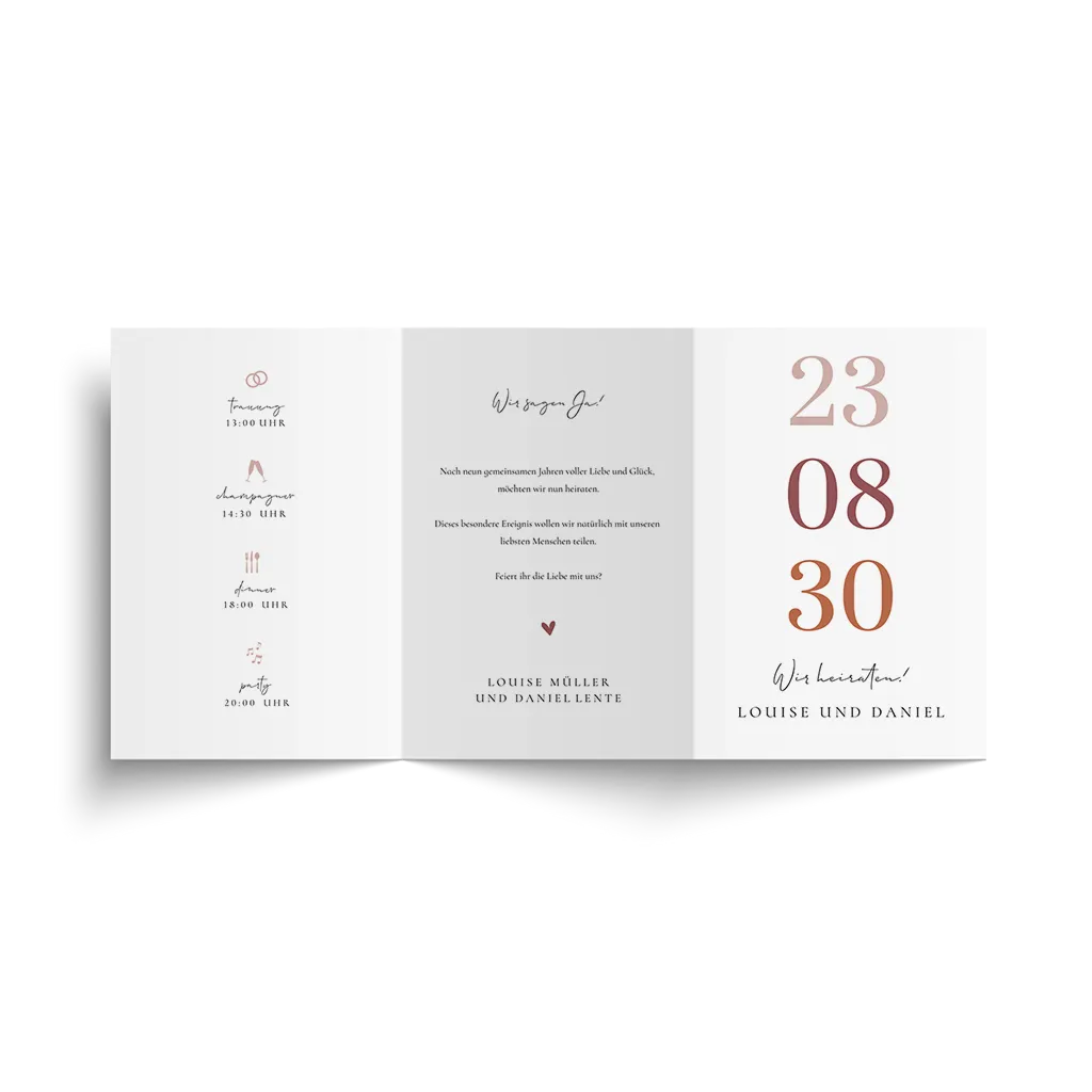 Dreiteilige Einladungskarte mit großen, bunten Zahlen. Dieses Design ist perfekt für Paare, die nach einer schlichten und stilvollen Einladung suchen.