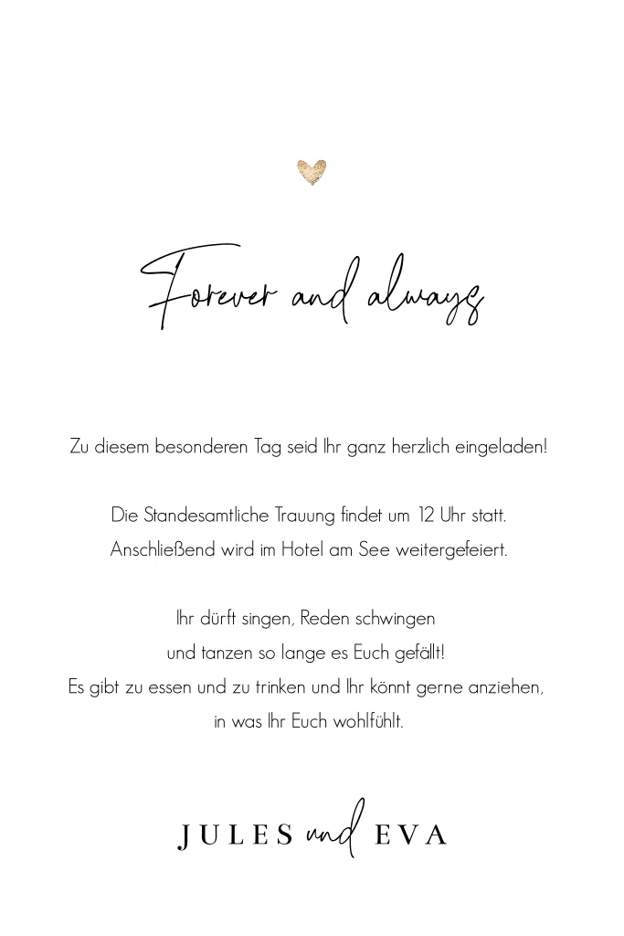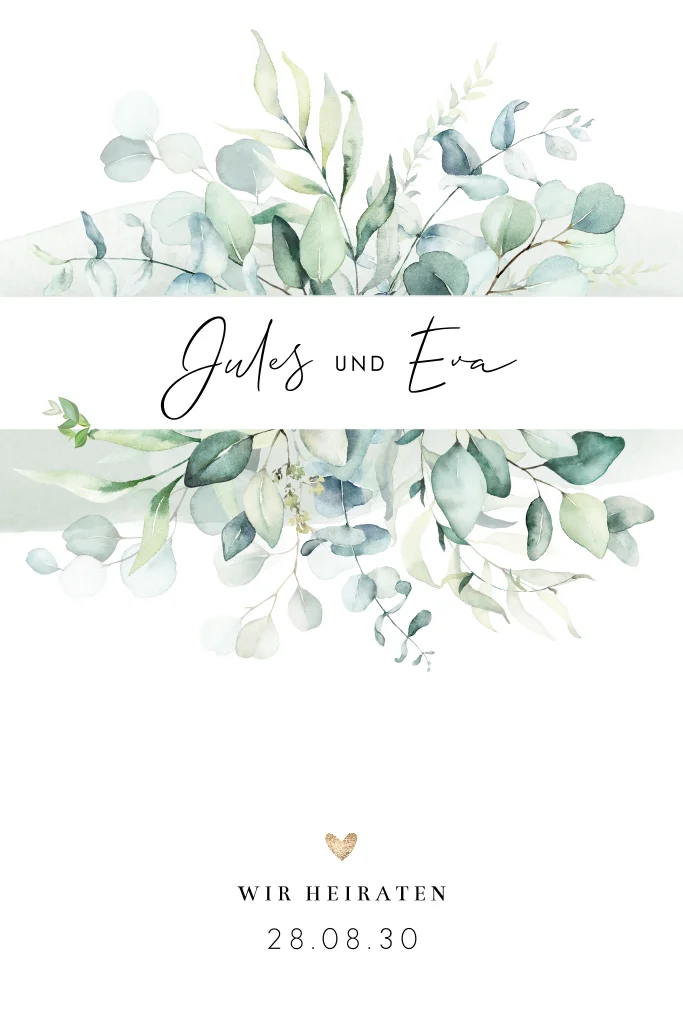 Stilvolle Einladung in Weiß mit goldfarbenen Herzen und grünen Zweigen, die ihr einen floralen Look verleihen. Dieses Design ist perfekt für Paare, die nach einer floralen und eleganten Einladung suchen.Melde dich für unseren Newsletter an und profitiere von exklusiven Angeboten, kreativen Ideen und Neuigkeiten aus unserer Produktwelt. Als Dankeschön für deine Anmeldung schenken wir dir einen kostenlosen Probedruck deiner Karte.