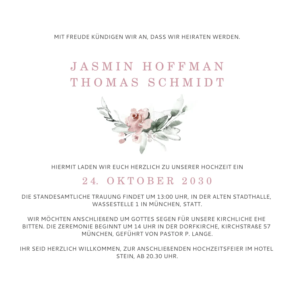 Stilvolle Hochzeitseinladung mit floralem Design und rosafarbenen Blüten im Aquarell-Look.Bei quadratische Karten fällt ggf. ein anderes Briefporto an. Alle Infos findest du auf der Website der Deutschen Post. Zu diesem Format erhältst du Umschläge in der Größe 14x12,5 cm. Format ändern ist möglich.