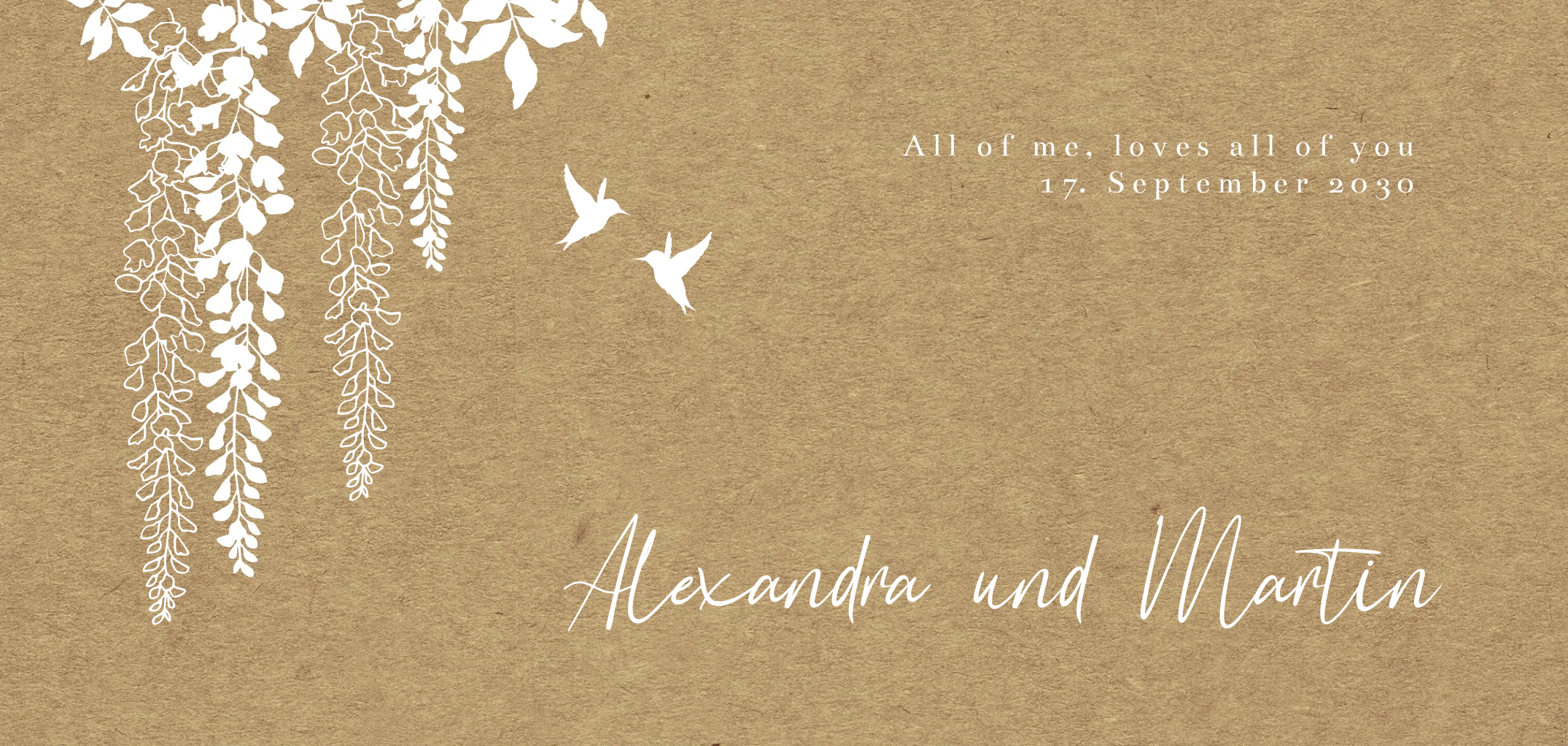 Längliche, doppelseitige Einladung aus robustem Kraftpapier. Neben hängenden Zweigen in weiß und gold und über euren Namen flattern zwei goldene Vögelchen.Melde dich für unseren Newsletter an und profitiere von exklusiven Angeboten, kreativen Ideen und Neuigkeiten aus unserer Produktwelt. Als Dankeschön für deine Anmeldung schenken wir dir einen kostenlosen Probedruck deiner Karte.