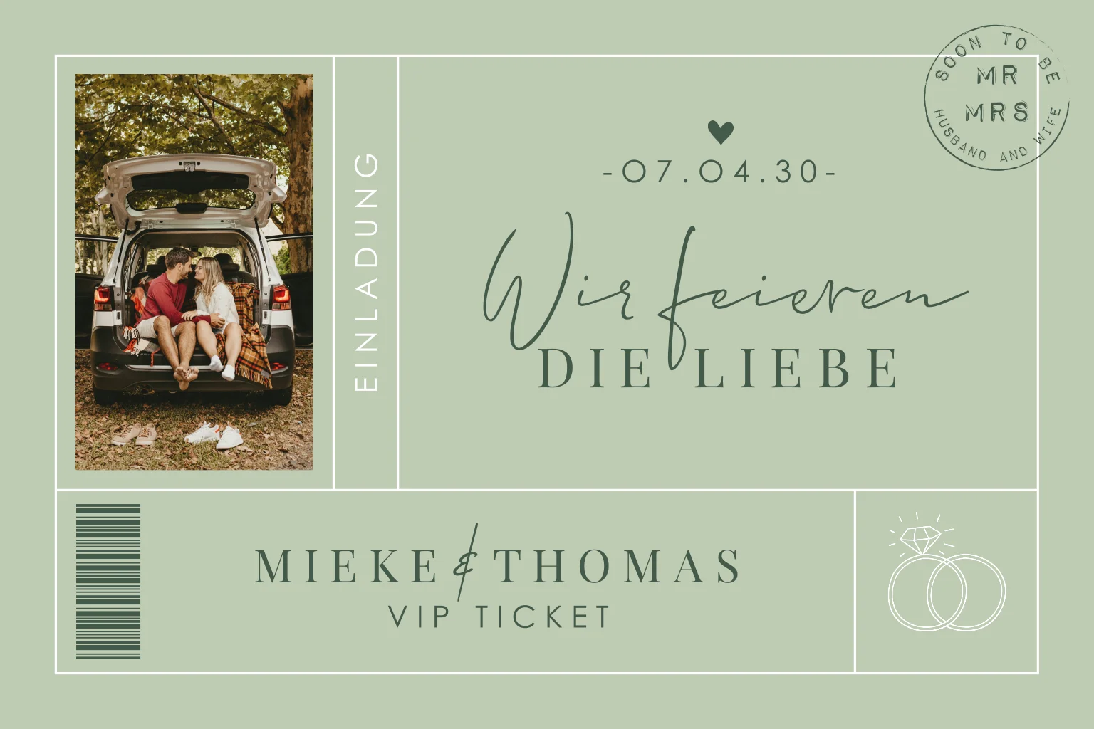 Hochzeitseinladung in Grün und Ticket-Stil mit Foto. Dieses Design ist perfekt für Paare, die nach einer verspielten und farbenfrohen Einladung suchen.Melde dich für unseren Newsletter an und profitiere von exklusiven Angeboten, kreativen Ideen und Neuigkeiten aus unserer Produktwelt. Als Dankeschön für deine Anmeldung schenken wir dir einen kostenlosen Probedruck deiner Karte.