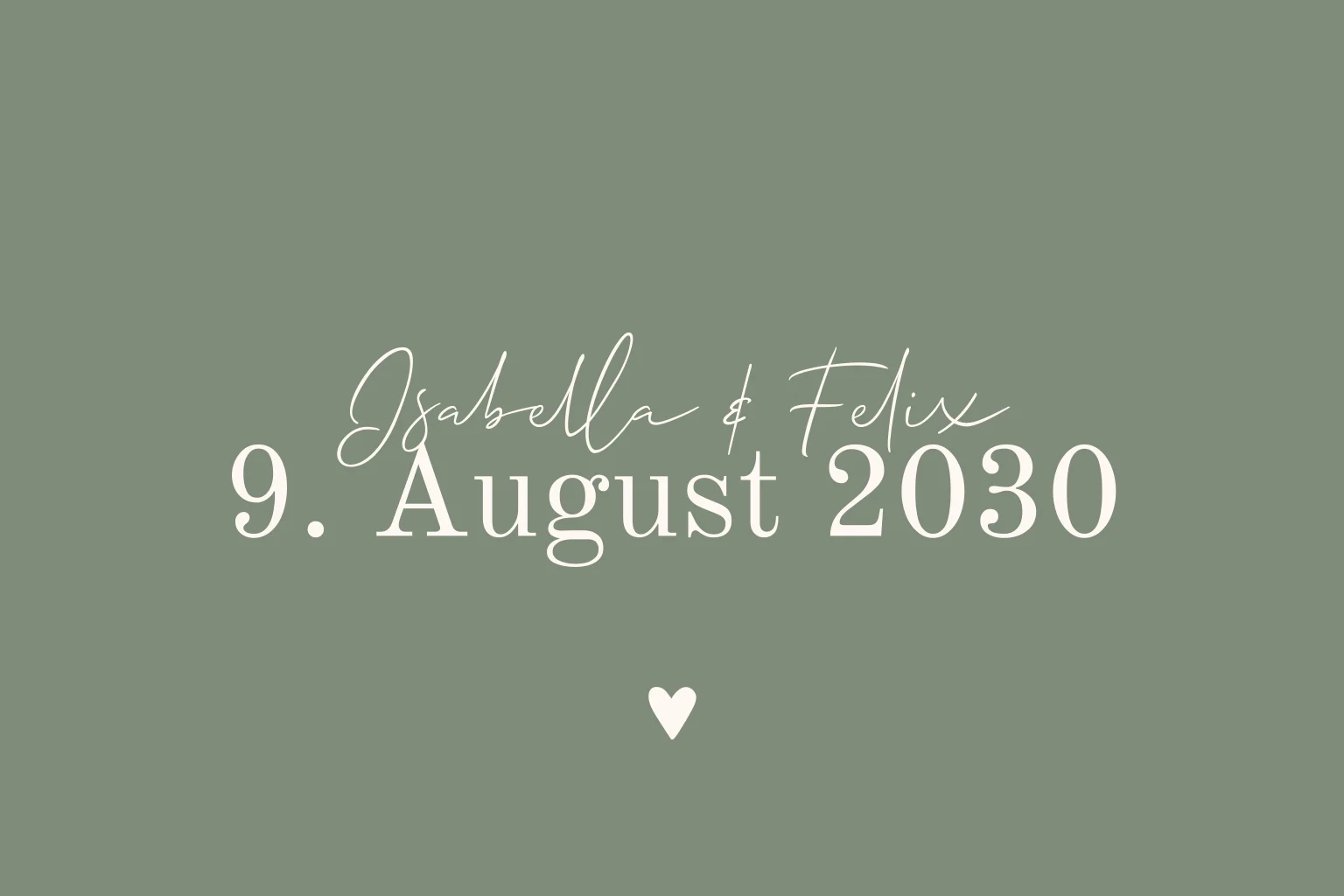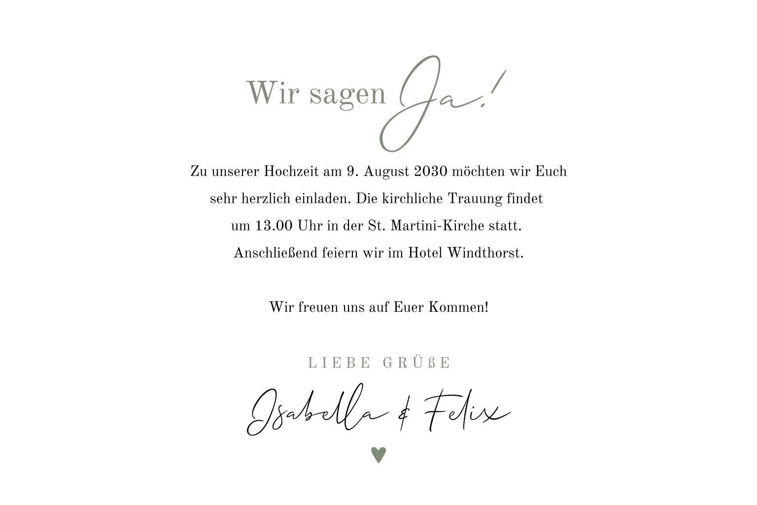 Grüne Einladungskarte mit weißer Schrift. Dieses Design ist perfekt für Paare, die nach einer einfarbigen und schlichten Einladung suchen.