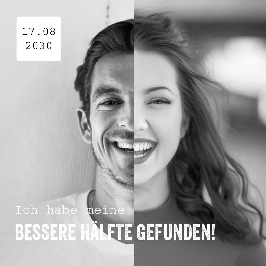 Hier findest du alle unsere Hochzeitskarten mit Kalender. Hochzeitseinladung mit Paarfoto und Herz in Schwarz-Weiß. Dieses Design ist perfekt für Paare, die nach einer modernen und ausgefallenen Einladung suchen.Bei quadratische Karten fällt ggf. ein anderes Briefporto an. Alle Infos findest du auf der Website der Deutschen Post. Zu diesem Format erhältst du Umschläge in der Größe 14 x 12,5 cm. Format ändern ist möglich.
