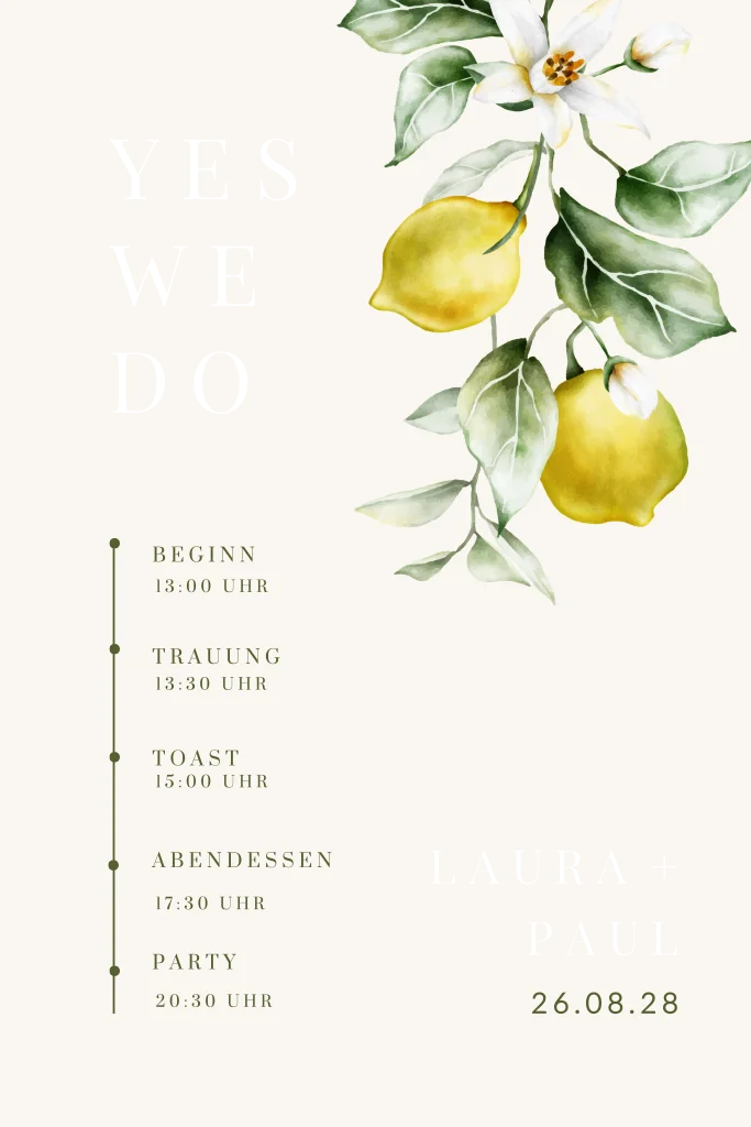 Sieh dir hier all unsere Hochzeitseinladungen mit Zitronen an.