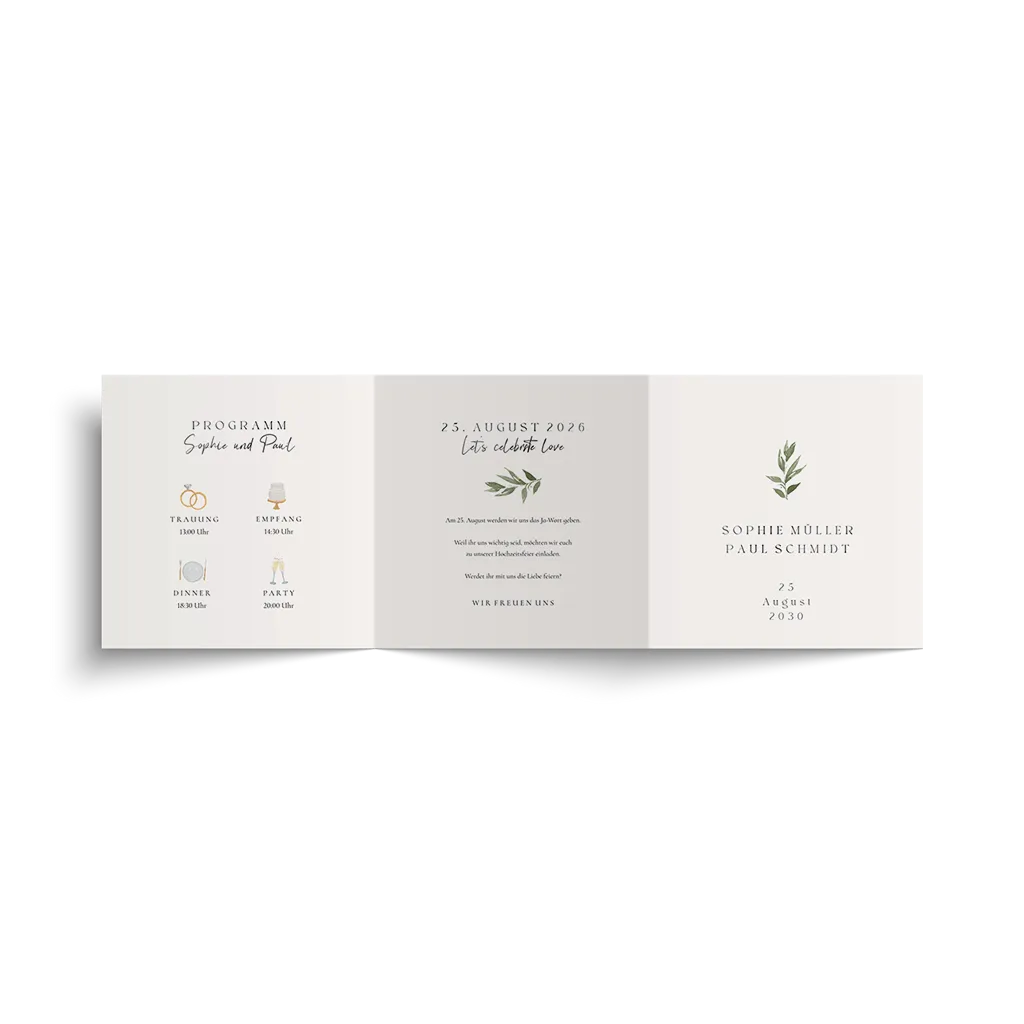 Hochzeitseinladung in Beige Triptychon mit Foto und Olivenzweigen.