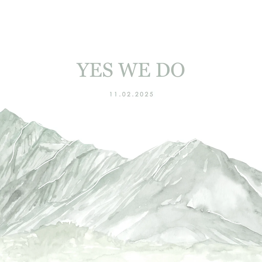 Quadratische Hochzeitseinladung mit gezeichneter Berglandschaft. Dieses Design ist perfekt für Paare, die nach einer schlichten und modernen Einladung suchen.Bei quadratische Karten fällt ggf. ein anderes Briefporto an. Alle Infos findest du auf der Website der Deutschen Post. Zu diesem Format erhältst du Umschläge in der Größe 14x12,5 cm. Format ändern ist möglich.