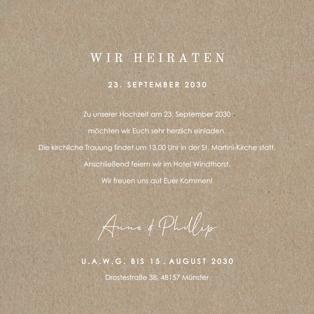 Einladungskarten auf Vintage Kraftpapier bestechen durch einen trendigen Designkarton im rustic Kraftpapier-Look und sind mit modernen Schriftzügen bestückt absolut im Trend. Die Innenseiten als auch die Rückseite der Klappkarte bieten genug Platz für alle persönlichen Einladungsworte und Infos.
