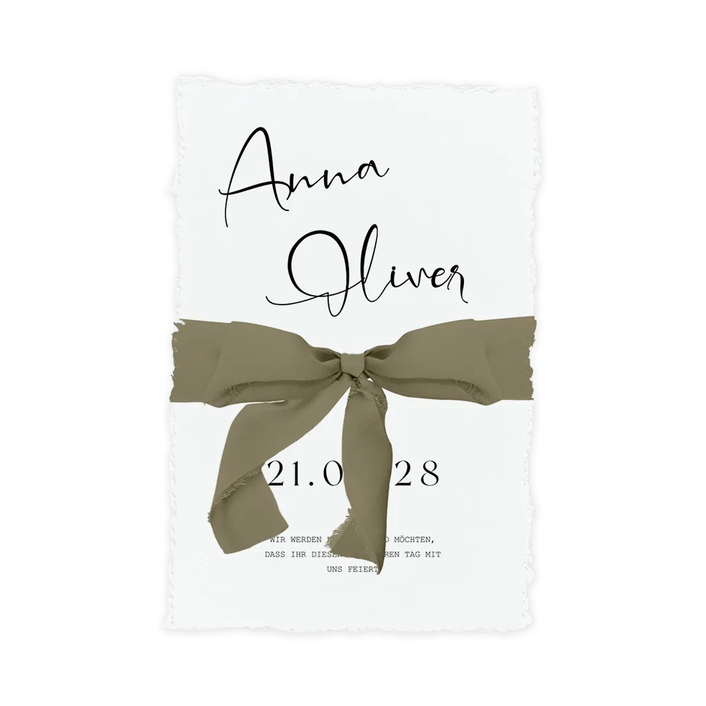 Hochzeitseinladung im Büttenpapier-Look mit Salbeigrün Schleifenband und handgeschriebener Schrift.