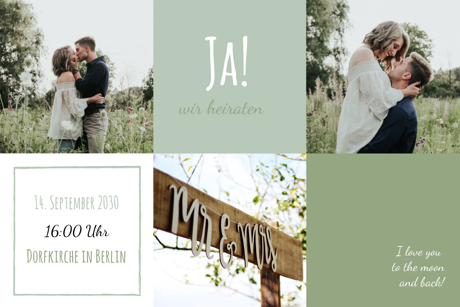 Schickt euren Hochzeitsgästen diese traumhafte Hochzeitseinladung mit vier wunderschönen Fotos von euch als zukünftiges Hochzeitspaar! Ihr könnt die Farben und Texte nach euren Wünschen wählen und die Karte vollständig an den Stil der Hochzeit anpassen.Das Design der von dir gewählten Karte wurde automatisch in andere Formate umgestellt. Wähle einfach deinen Wunschformat aus und platziere alle Texte und Elemente an der richtigen Stelle im Editor. Du hast Fragen oder dein Favorit steht nicht zur Auswahl? Dann kontaktiere uns bitte und wir werden uns gemeinsam darum kümmern!
