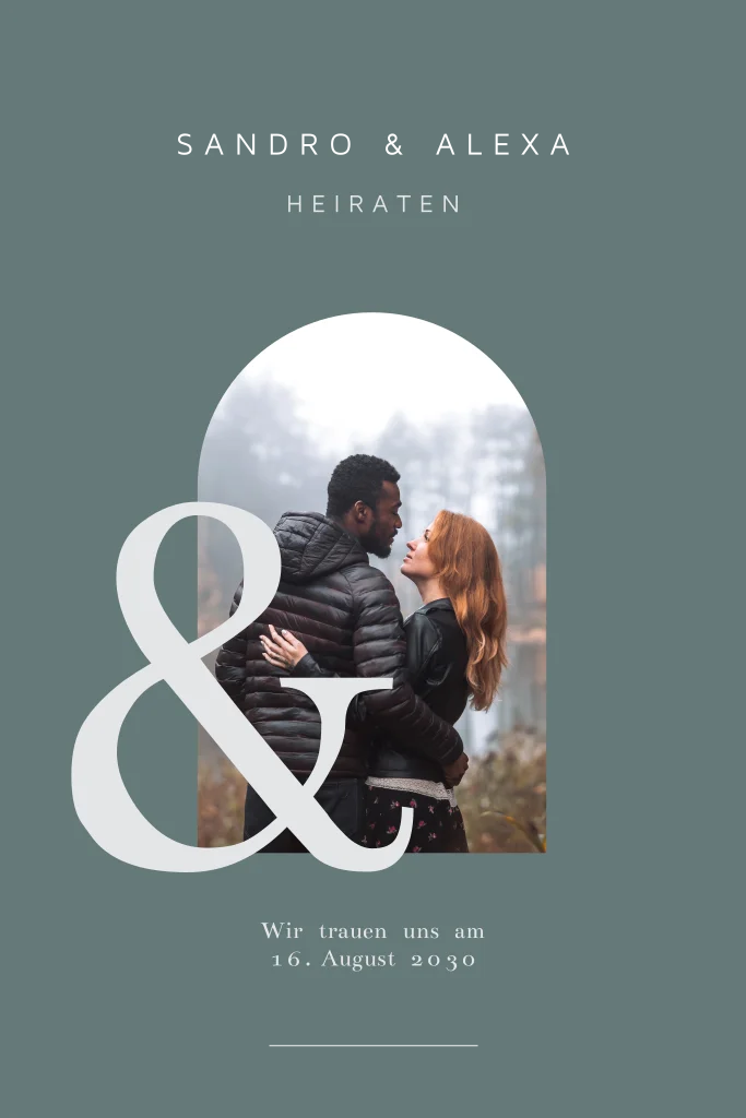 Hier findest du alle unsere Hochzeitskarten mit Kalender. Hochzeitseinladung in Petrolgrün mit Foto in gebogener Form. Dieses Design ist perfekt für Paare, die nach einer stilvollen und romantischen Einladung suchen.Sieh dir auch die dazugehörige Save the date Karte, Menükarte und Dankeskarte an.