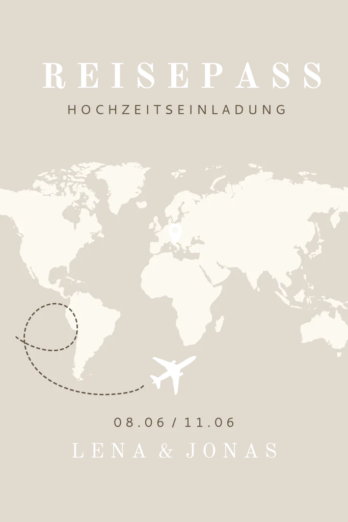 Seid ihr ein reiselustiges Paar und feiert eure Hochzeit im Ausland? Dann ist die Hochzeitseinladung "Reisepass" die perfekte Wahl für euch. Personalisiert sie einfach im Editor.Das Design der von dir gewählten Karte wurde automatisch in andere Formate umgestellt. Wähle einfach deinen Wunschformat aus und platziere alle Texte und Elemente an der richtigen Stelle im Editor. Du hast Fragen oder dein Favorit steht nicht zur Auswahl? Dann kontaktiere uns bitte und wir werden uns gemeinsam darum kümmern!