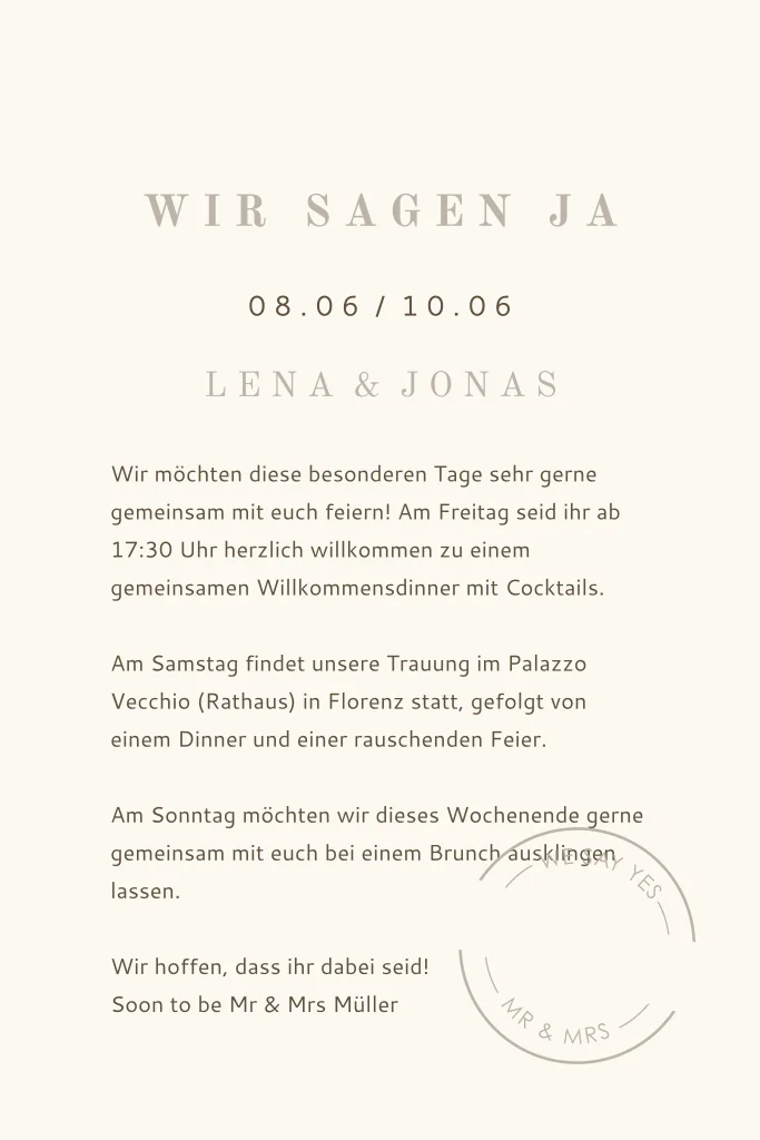 Seid ihr ein reiselustiges Paar und feiert eure Hochzeit im Ausland? Dann ist die Hochzeitseinladung "Reisepass" die perfekte Wahl für euch. Personalisiert sie einfach im Editor.Melde dich für unseren Newsletter an und entdecke exklusive Angebote, kreative Inspirationen und spannende Neuigkeiten aus unserer Produktwelt. Als Dankeschön erhältst du 5 € Rabatt auf deine nächste Bestellung.