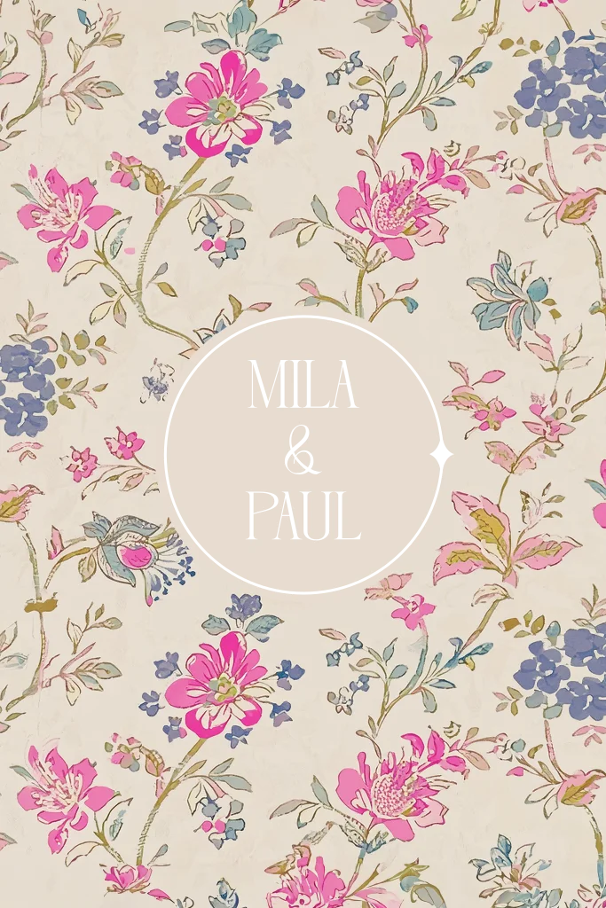 Beige Hochzeitseinladung mit romantischem Blumenmuster und goldenen Elementen. Dieses Design ist perfekt für Paare, die nach einer stilvollen und floralen Einladung suchen.