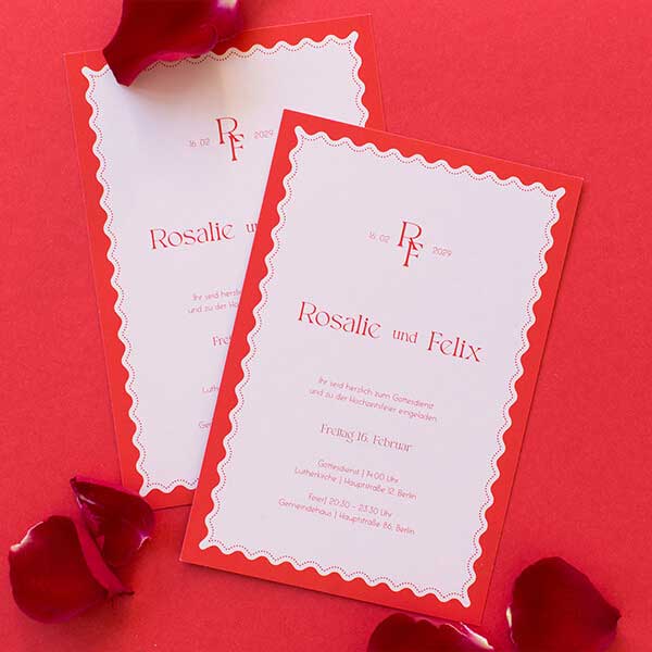 Hochzeitseinladung in Rot mit gewellten Rahmen. Dieses Design ist perfekt für Paare, die nach einer modernen und farbenfrohen Einladung suchen.