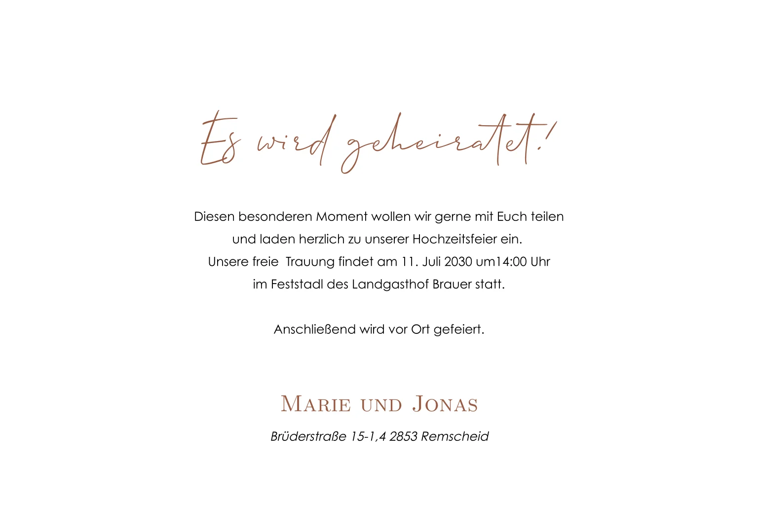 Hochzeitseinladung in Braun mit Goldfolie und Herz. Dieses Design ist perfekt für Paare, die nach einer schlichten und stilvollen Einladung suchen.Melde dich für unseren Newsletter an und profitiere von exklusiven Angeboten, kreativen Ideen und Neuigkeiten aus unserer Produktwelt. Als Dankeschön für deine Anmeldung schenken wir dir einen kostenlosen Probedruck deiner Karte.