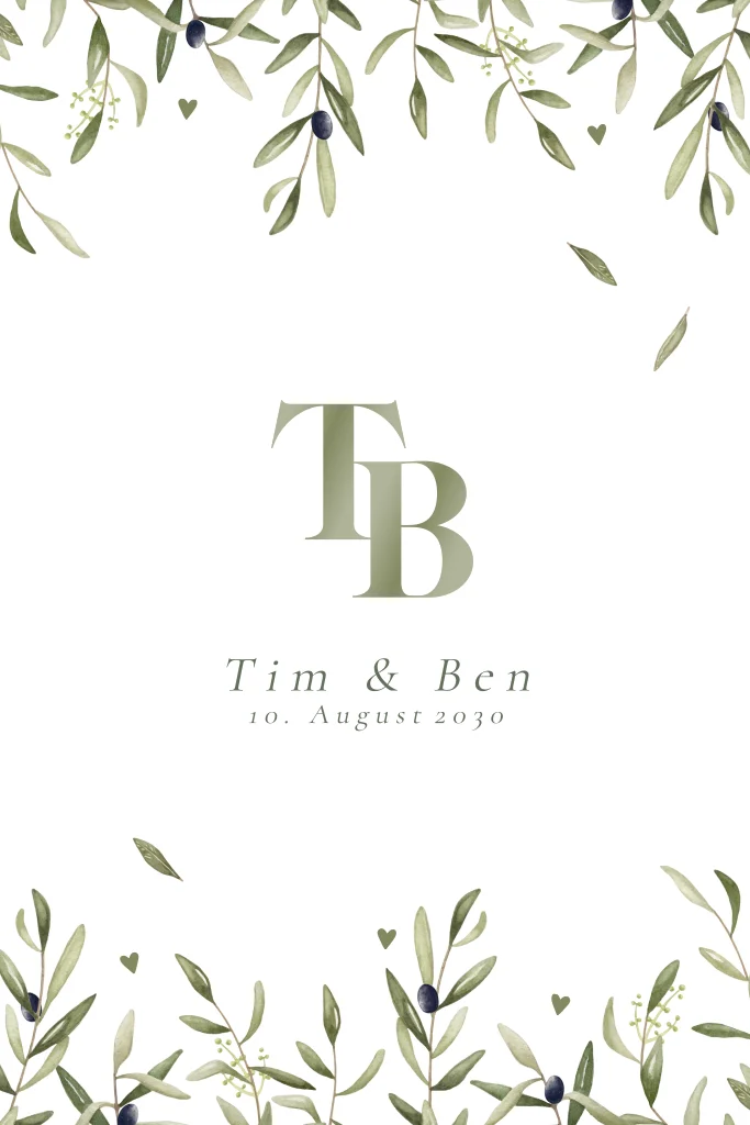 Hochzeitseinladung in Weiß mit Blättern und Initialen