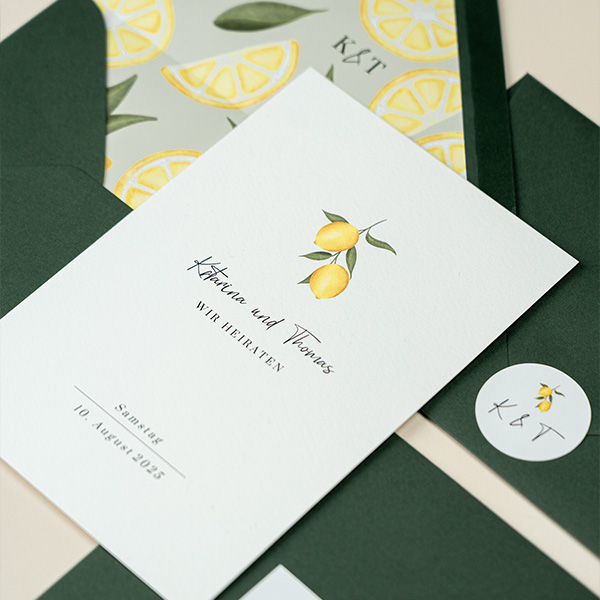 Schlichte Einladungskarte mit Zitronen. Dieses Design ist perfekt für Paare, die nach einer sommerlichen und stilvollen Einladung suchen.