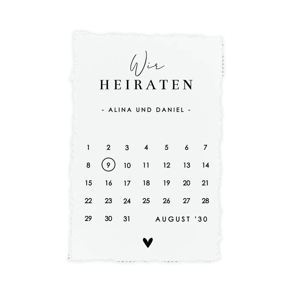 Minimalistische Einladungskarte mit Kalender und Herz. Dieses Design ist perfekt für Paare, die nach einer schlichten und zeitlosen Einladung suchen.