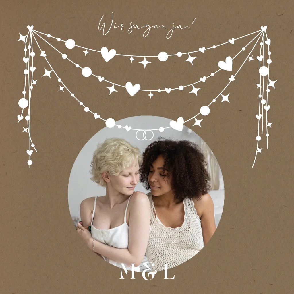Quadratische Hochzeitseinladung mit Foto, Girlanden mit Herzchen und Goldfolie. Dieses Design ist perfekt für Paare, die nach einer romantischen und verspielten Einladung suchen.
