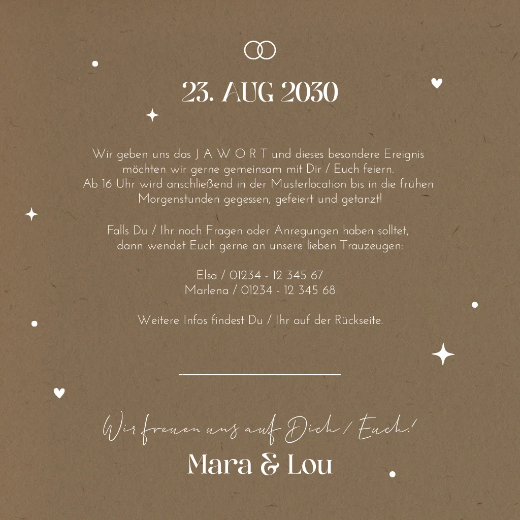 Das Design der von dir gewählten Karte wurde automatisch in andere Formate umgestellt. Wähle einfach deinen Wunschformat aus und platziere alle Texte und Elemente an der richtigen Stelle im Editor. Du hast Fragen oder dein Favorit steht nicht zur Auswahl? Dann kontaktiere uns bitte und wir werden uns gemeinsam darum kümmern!