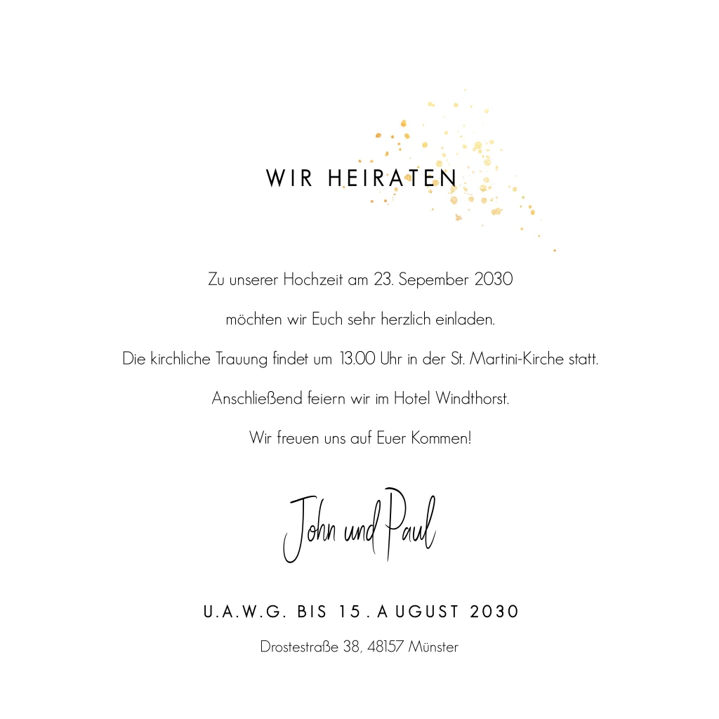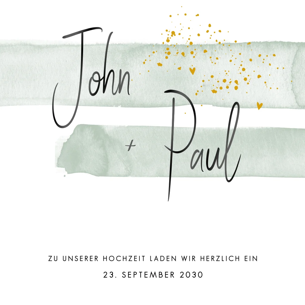 Hochzeitseinladung mit grünem Streifen im Aquarell-Look und Tagesplan. Dieses Design ist perfekt für Paare, die nach einer schlichten und stilvollen Einladung suchen.Bei quadratische Karten fällt ggf. ein anderes Briefporto an. Alle Infos findest du auf der Website der Deutschen Post. Zu diesem Format erhältst du Umschläge in der Größe 14 x 12,5 cm. Format ändern ist möglich.
