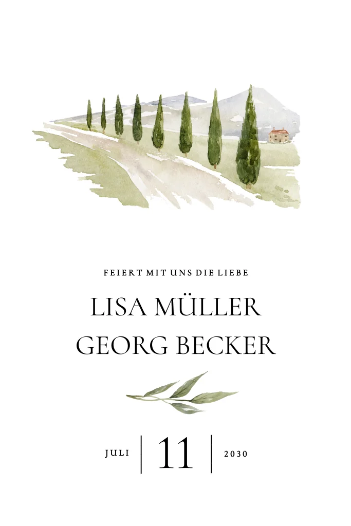 Hier findest du alle unsere Hochzeitskarten mit Kalender. Schlichte Hochzeitseinladung mit Aquarell-Landschaft. Dieses Design ist perfekt für Paare, die nach einer sommerlichen und schlichten Einladung suchen.Bei quadratische Karten fällt ggf. ein anderes Briefporto an. Alle Infos findest du auf der Website der Deutschen Post. Zu diesem Format erhältst du Umschläge in der Größe 14 x 12,5 cm. Format ändern ist möglich.