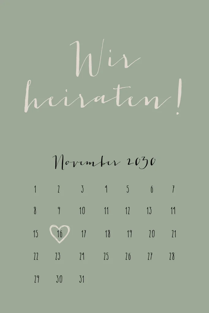 Hier findest du alle unsere Hochzeitskarten mit Kalender. Hier findest du alle unsere Hochzeitskarten mit Kalender. Grüne Hochzeitseinladung mit Kalenderblatt und lebendiger Schrift. Dieses Design ist perfekt für Paare, die nach einer stilvollen und schlichten Einladung suchen.