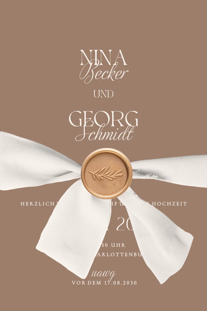 Tipp: Um das Kartenset zu verzieren, kannst du wie im dargestellten Beispiel, Samtband und Lacksiegel benutzen. Siehe auch: Extraprodukte für Hochzeitskarten
