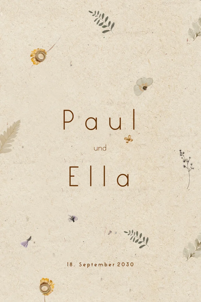 Beige Hochzeitseinladung mit Trockenblumen. Dieses Design ist perfekt für Paare, die nach einer stilvollen und floralen Einladung suchen.Melde dich für unseren Newsletter an und entdecke exklusive Angebote, kreative Inspirationen und spannende Neuigkeiten aus unserer Produktwelt. Als Dankeschön erhältst du 5 € Rabatt auf deine nächste Bestellung.