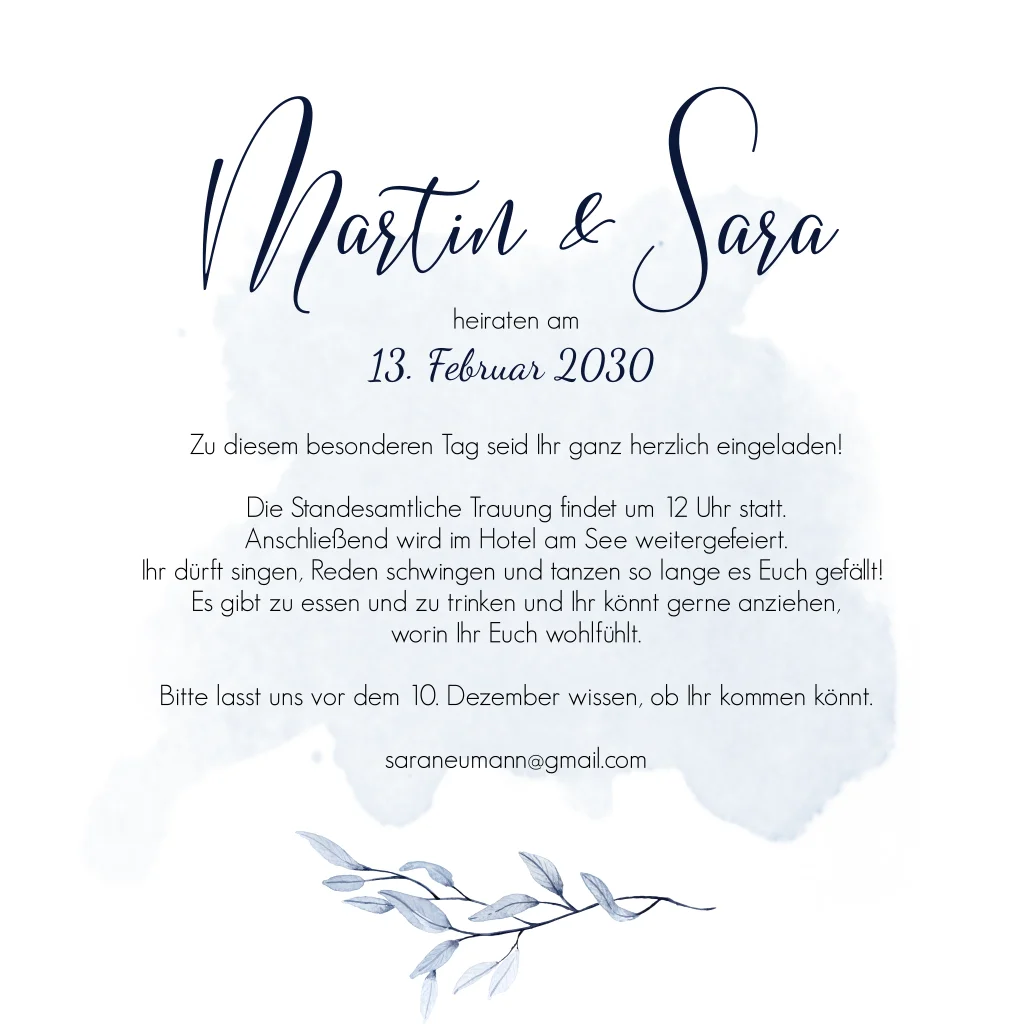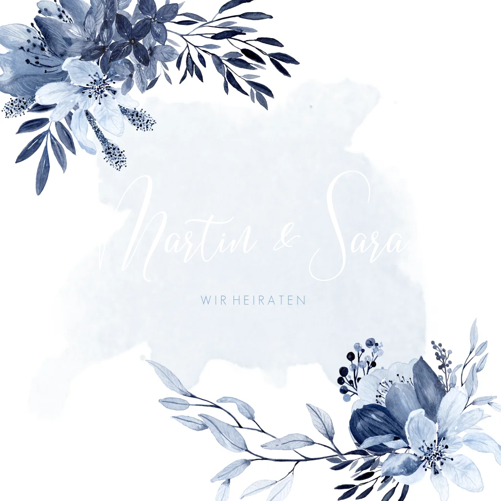 Quadratische Hochzeitseinladung mit blauen Blüten. Dieses Design ist perfekt für Paare, die nach einer stilvollen und floralen Einladung suchen.