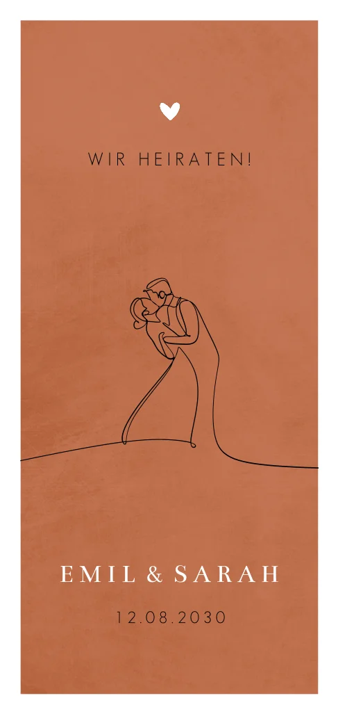 Die Hochzeitseinladung teilt euren Gästen die wichtigsten Informationen mit. Dazu zählen z.B. Hochzeitsdatum, Tagesablauf und Location. Ein auf der Karte integrierter Trauspruch sorgt optional für romantische Vorfreude bei den Gästen. Zum Schluss solltet ihr darum bitten, dass die Gäste bis zu einem gewissen Zeitpunkt zu- oder absagen. Bitte beachte: Durch den Zuschnitt der Karten können 1-3mm Breitenunterschied (links/rechts und oben/unten) am Rahmen auftreten. Tipp: Gestalte den Rand so groß wie möglich, damit dieser mögliche Unterschied nicht auffällt.Melde dich für unseren Newsletter an und profitiere von exklusiven Angeboten, kreativen Ideen und Neuigkeiten aus unserer Produktwelt. Als Dankeschön für deine Anmeldung schenken wir dir einen kostenlosen Probedruck deiner Karte.