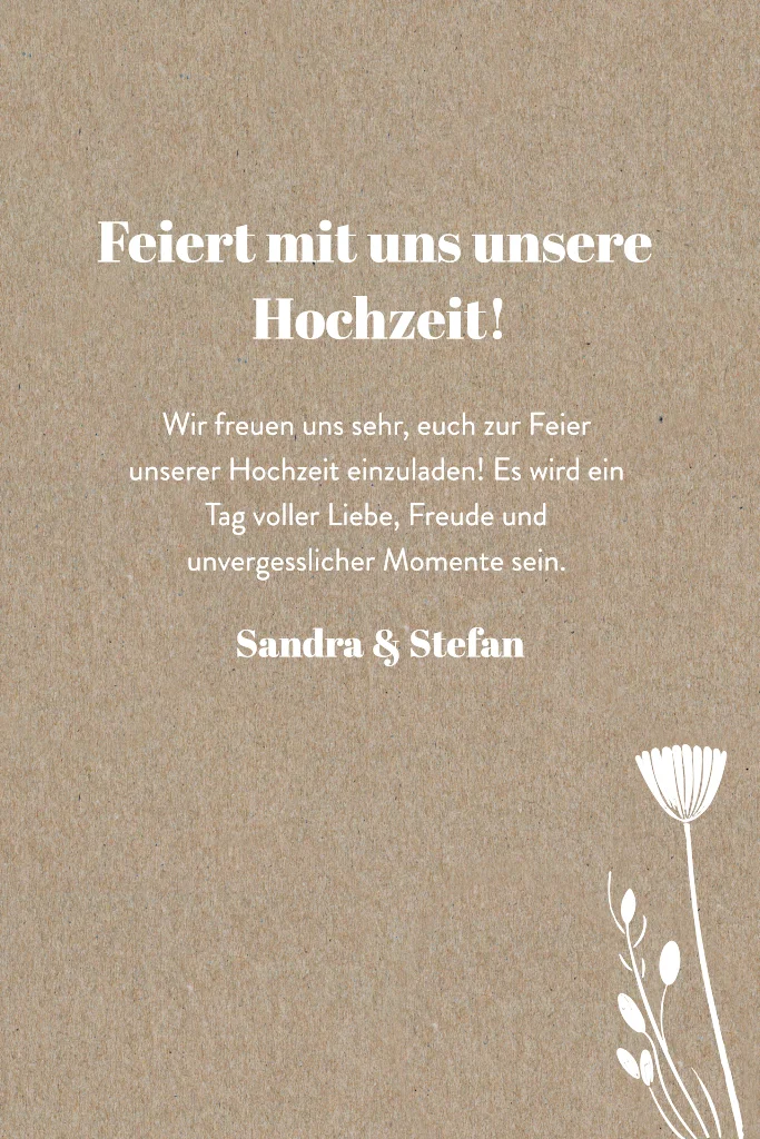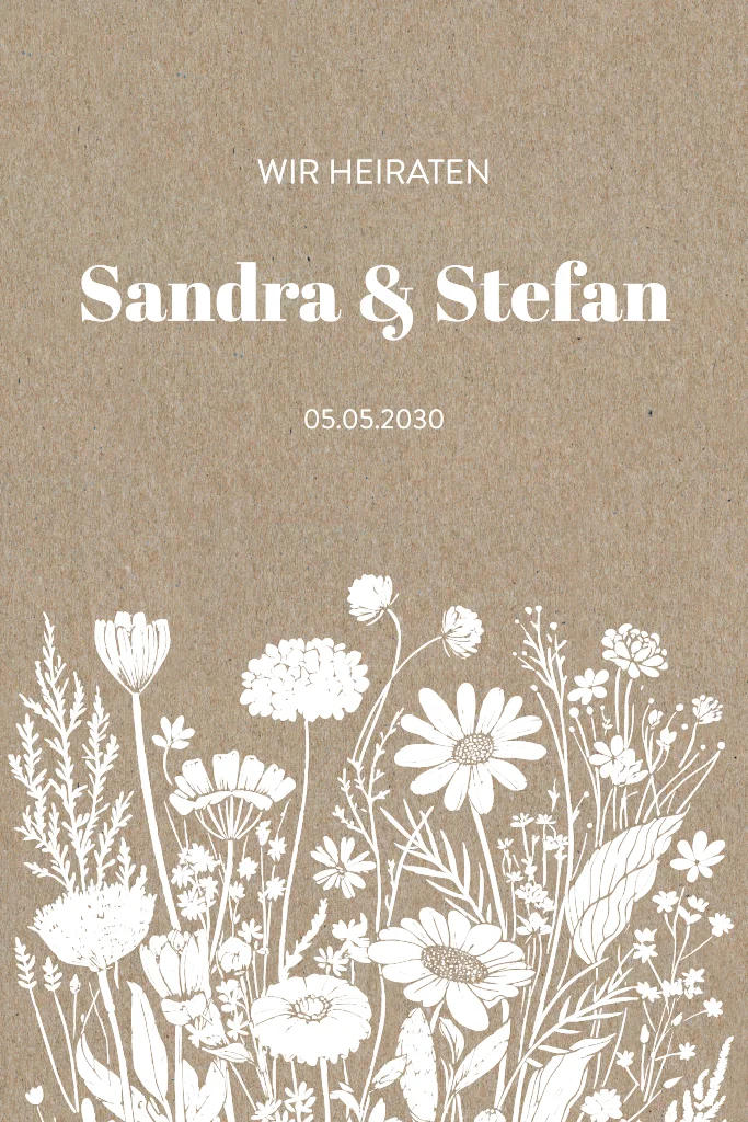 Hochzeitseinladung im Kraft-Look mit weißen Blumen. Dieses Design ist perfekt für Paare, die nach einer natürlichen und floralen Einladung suchen.