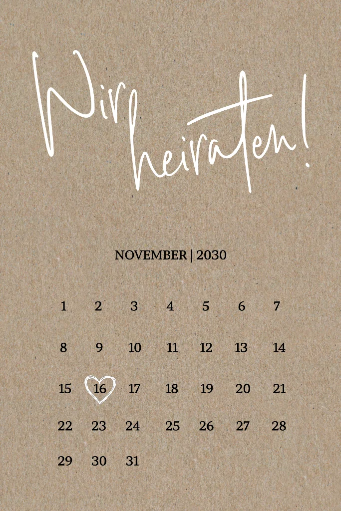 Hochzeitseinladung im Kraft-Look mit Kalenderblatt und weißer Schrift. Dieses Design ist perfekt für Paare, die nach einer natürlichen und schlichten Einladung suchen. Gut zu wissen:Melde dich für unseren Newsletter an und profitiere von exklusiven Angeboten, kreativen Ideen und Neuigkeiten aus unserer Produktwelt. Als Dankeschön für deine Anmeldung schenken wir dir einen kostenlosen Probedruck deiner Karte.