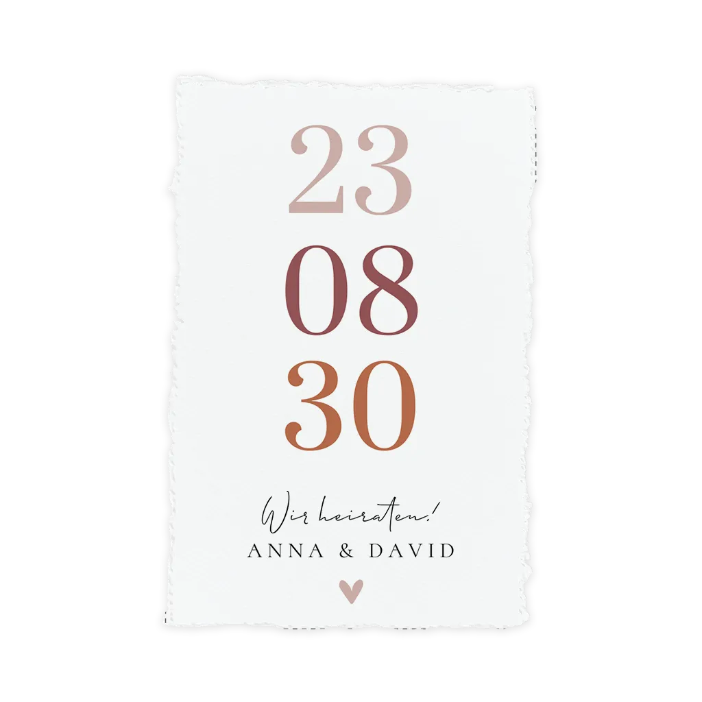 Hochzeitseinladung mit Datum in Rosatönen und Herz. Dieses Design ist perfekt für Paare, die nach einer schlichten und romantischen Einladung suchen.